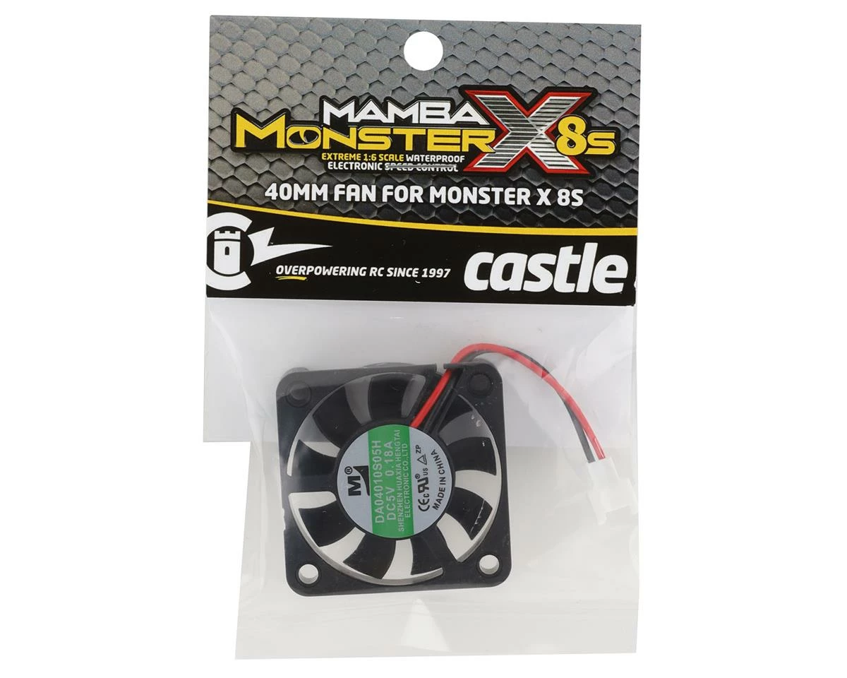 Castle Creations 40×40 Mamba Monster X 8S ESC Cooling Fan. This replacement cooling fan is intended for the Castle Creations Mamba Monster X 8S (CSE010-0165-00). Package includes one cooling fan.