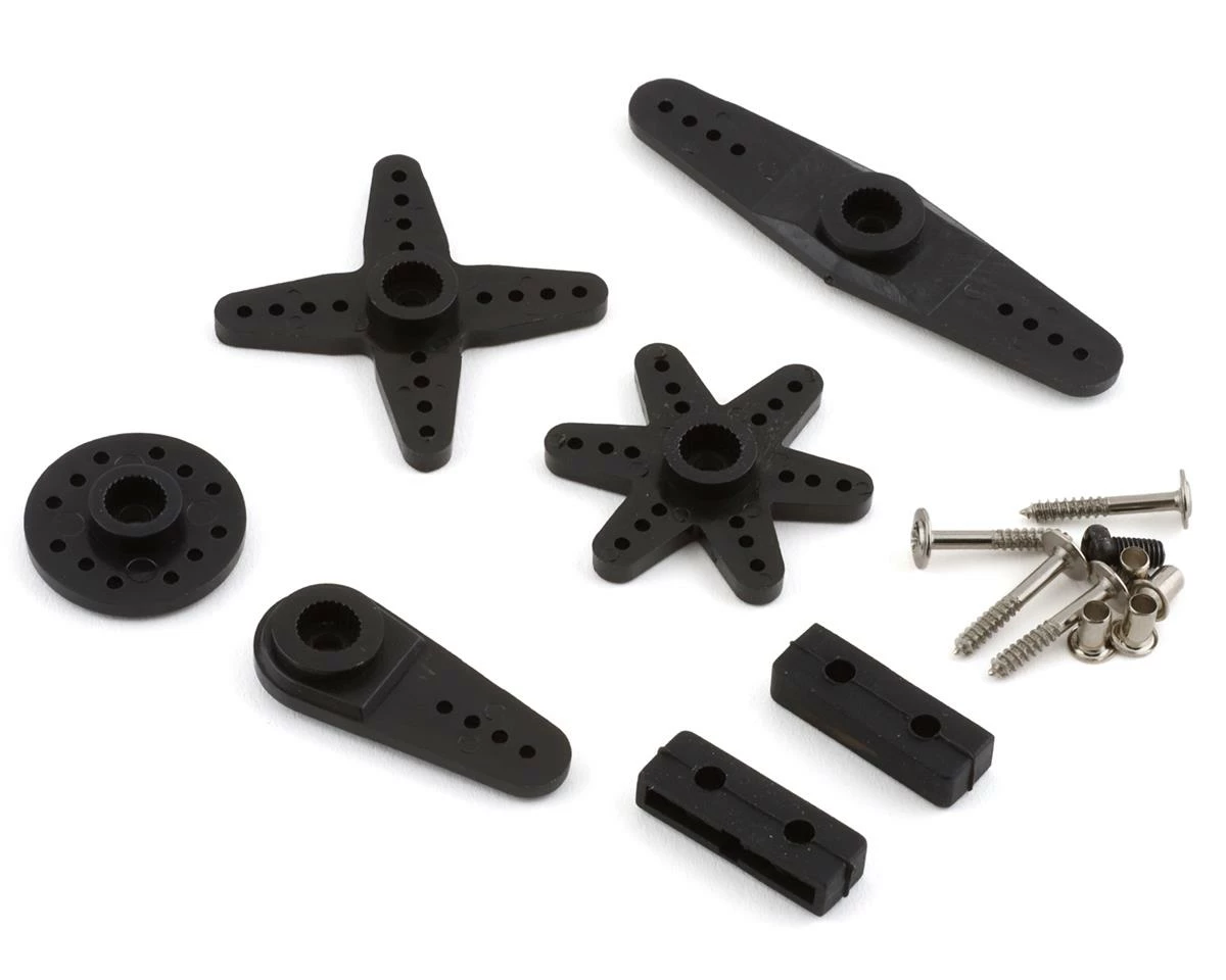 - Includes plastic star, 4 way, dual, single and round arm type servo horns and mounting hardware