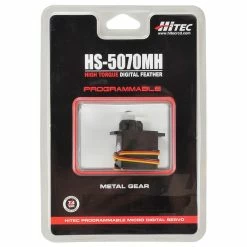 This is the Hitec HS-5070MH Digital HV Ultra Torque Metal Gear Feather Servo. The HS-5070MH possess the performance qualities necessary for 42-48 inch performance 3D aircraft and 450-size helicopters. Featuring Hitec’s durable metal gears, cored motors, top ball bearings and Generation 1 circuitry, these additions to the Hitec servo family will have all your planes and helis flying with remarkable precision and power. The programmable HS-5070MH delivers an impressive 53 oz.-in. of torque at 7.4 volts.
