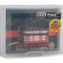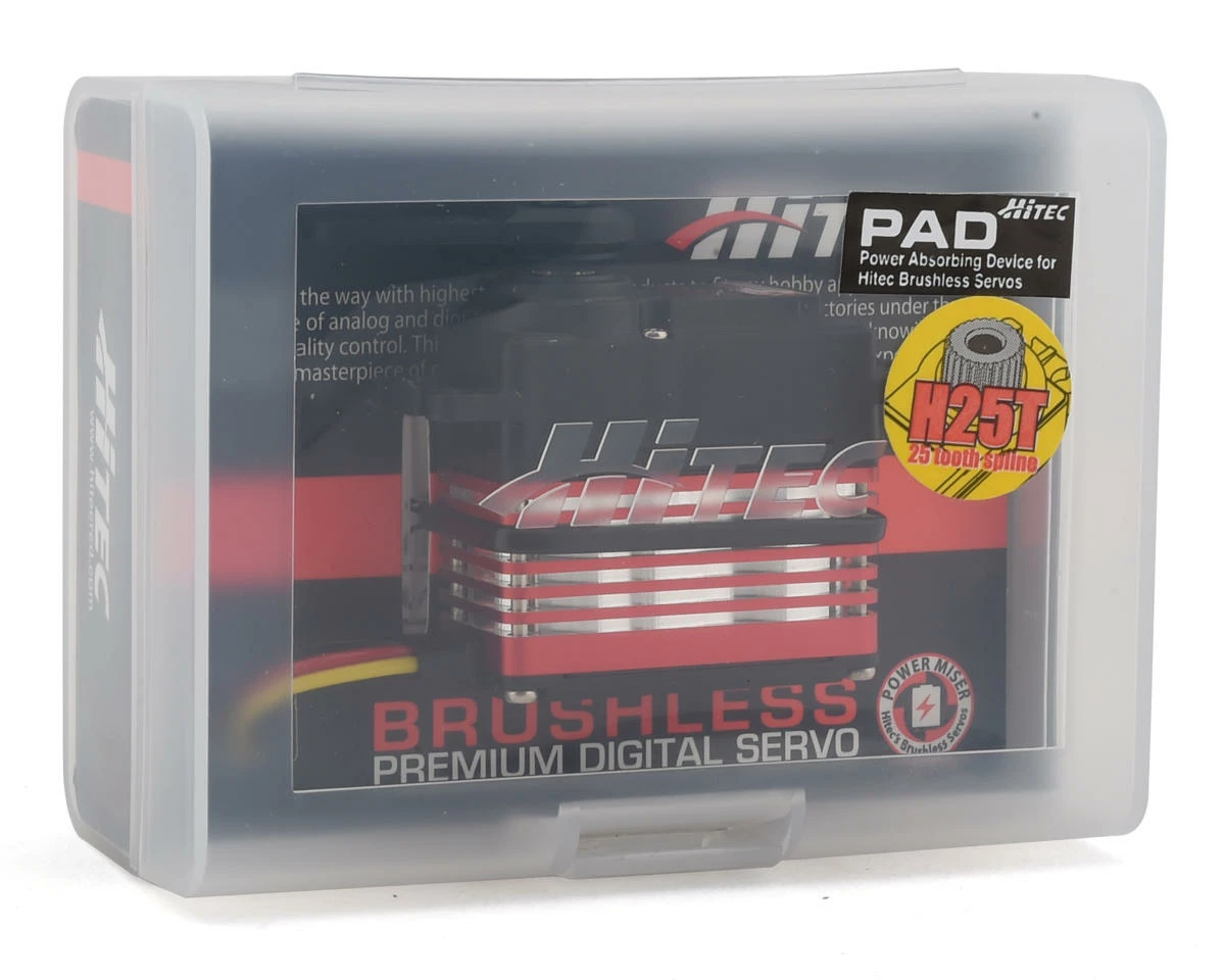 NOTE: While compatible with most radio control devices, the regenerative braking feature of the HSB-9XXX series servos may cause a problem if the device cannot accept a backflow of current. The types of devices that cannot accept this backflow are: Voltage Regulators, Power Safe Receivers and certain BEC circuits whether stand alone or integrated within an Electronic Speed Control. Check with the manufacturer or the Hitec website for a list of compatible models. If your device cannot accept a current backflow, then you must install a PAD (Power Absorbing Device – HRC55756) as described in the manual. A PAD is included with every Hitec brushless servo.