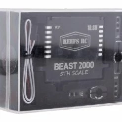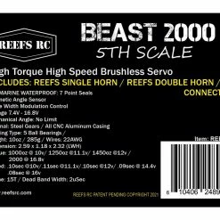 Reefs RC Beast 2000 Waterproof Digital 1/5 Scale Brushless Servo. This monster 1/5 scale servo is capable of up to 2000oz-in. at 16.8V and 0.09/60° sec! To connect this servo there is a standard servo connector with a ground and signal wire and a JST connector for main power and ground. Two power adapters are included to connect the JST connector to the balance lead of either a 3S or 4S battery. Package includes one servo, two power adapters, two servo horns and hardware.