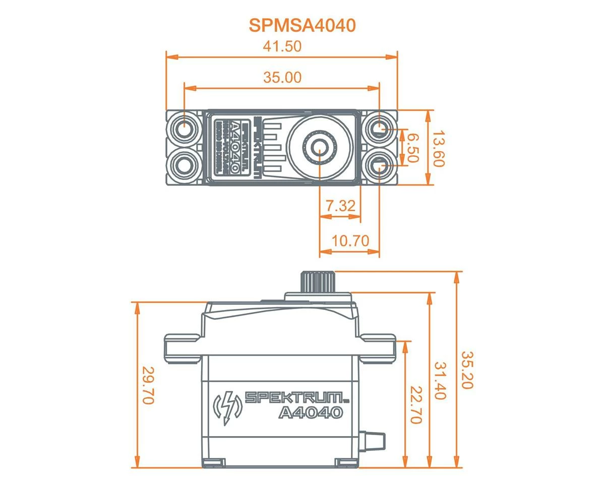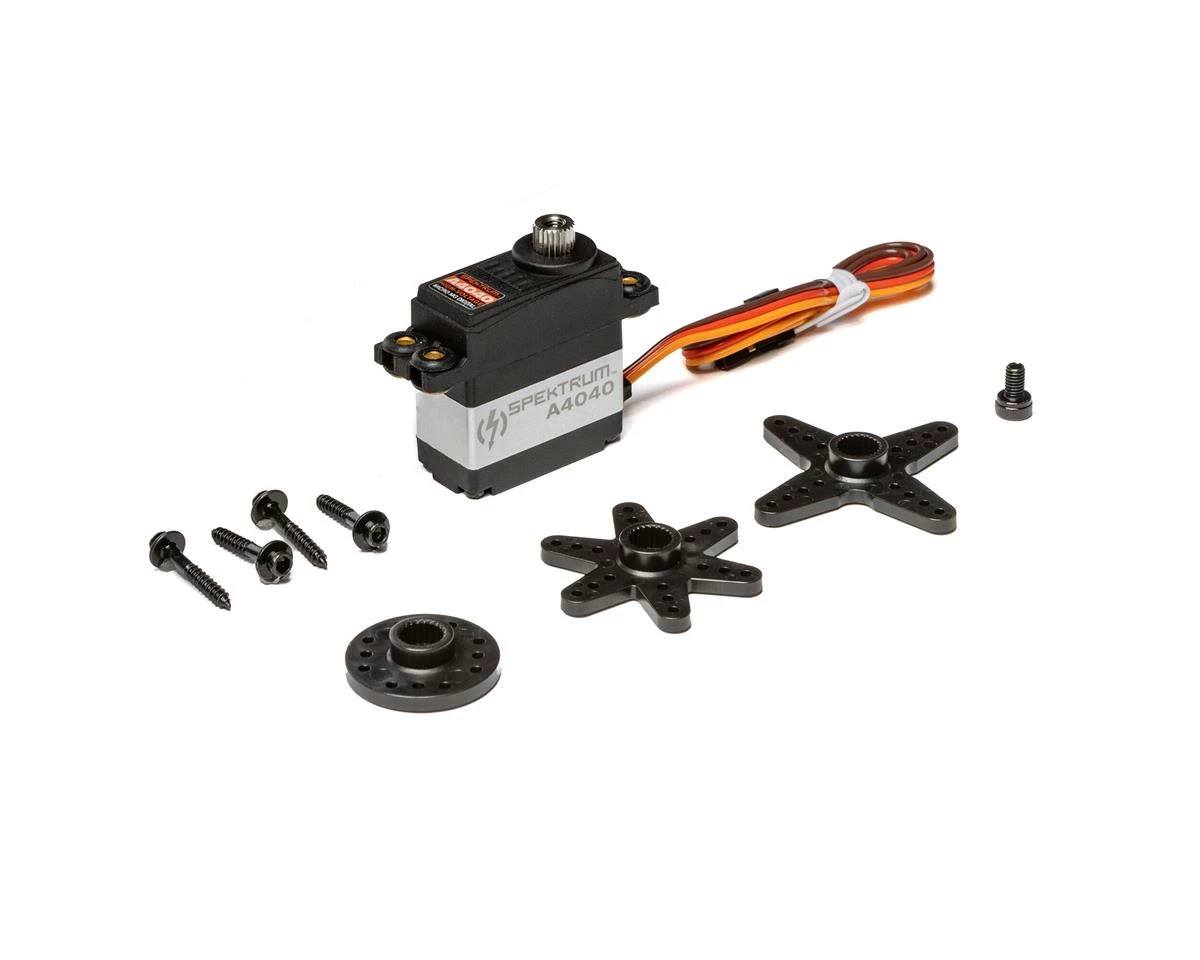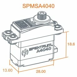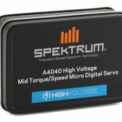 The Spektrum RC A4040 MT/HS Micro Metal Gear Servo is a great option for high performance smaller sport planes (15-25 size). High voltage capable, this servo can produce 96oz of toque at 0.094sec/60° with 8.4V input. A low wear metal gear drive train is supported by a single ball bearing for smooth operation. Completing the build is a center aluminum band for added reliability and durability. Take to the skies with the Spektrum RC A4040 servo.