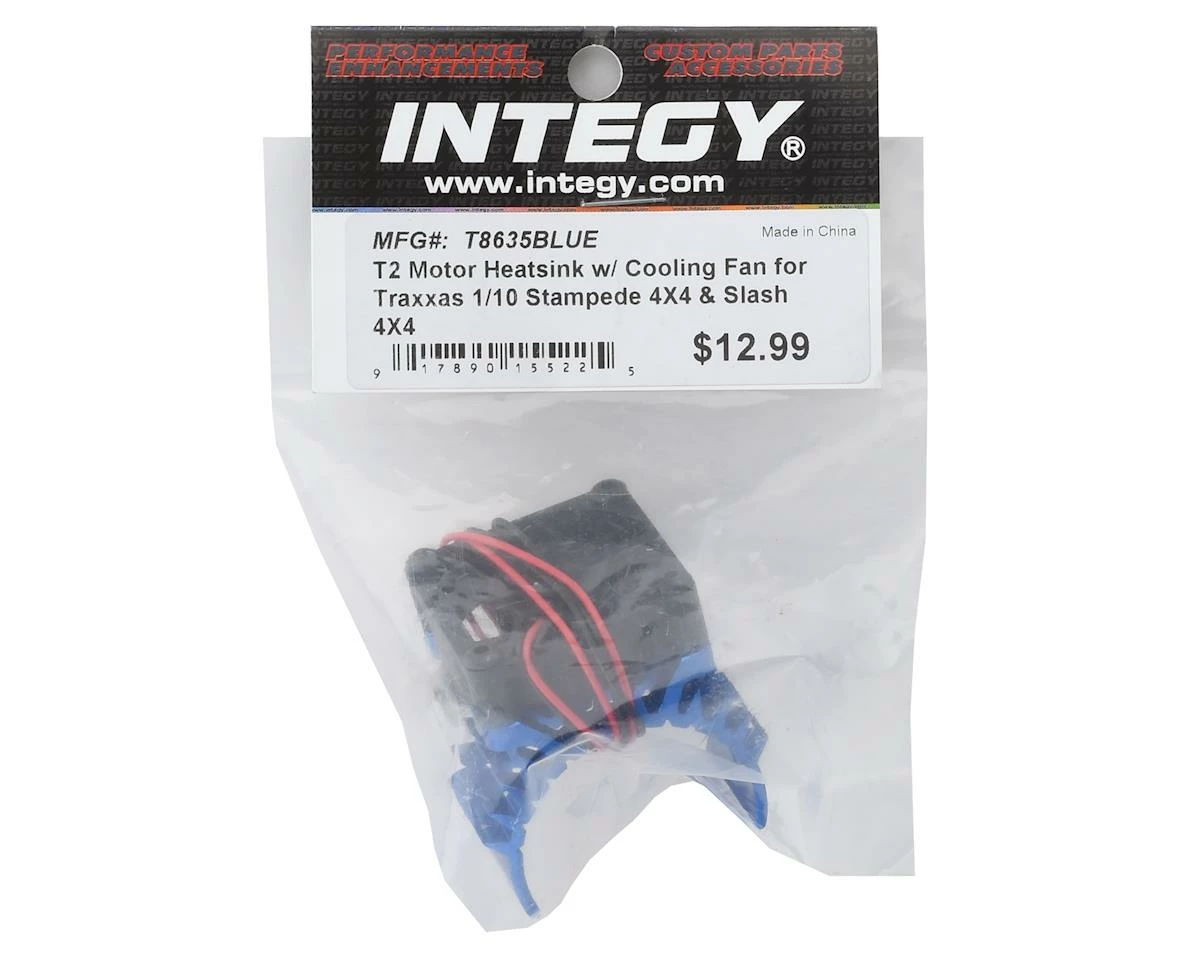 This is the Team Integy T2 Motor Heatsink with Fan, intended for use with the Traxxas Stampede and Slash 4×4 kits. When it comes to electric motors heat is the enemy. Keep your temperatures in check and your motor running efficient and cool with Team Integys T2 Motor Heatsink with Cooling Fan. The motor heatsink clips right onto the motor, and features an anodized coating and multiple heatsink fins for added cooling surface area. The 35mm cooling fan is designed to run off a 12.0VDC (3S LiPo) power source, powered through a standard 2-pin Rx plug.
